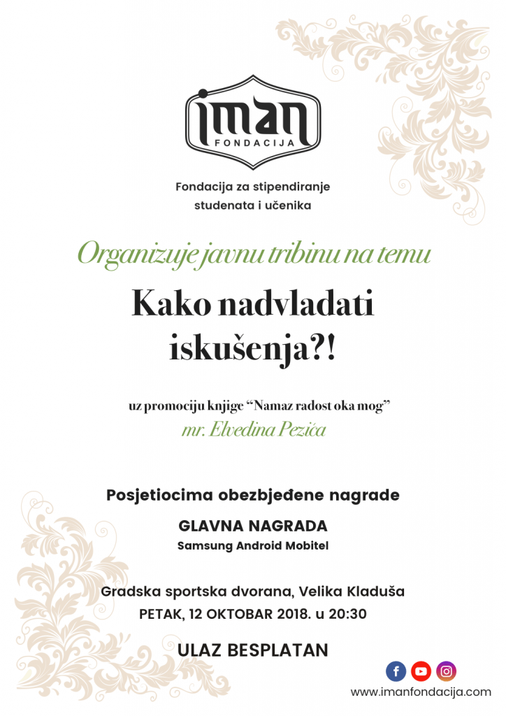 Fondacija za stipendiranje studenata i učenika “IMAN” organizira Javnu tribinu na temu “Kako nadvladati iskušenja” i promociju knjige uvaženog mr. Elvedina Pezića “Namaz radost oka mog”