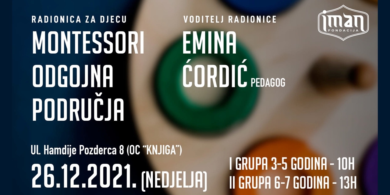 Fondacija IMAN organizuje kreativnu radionicu za male prijatelje od 3 do 7 godina pod nazivom “Montessori – ODGOJNA PODRUČJA”.
